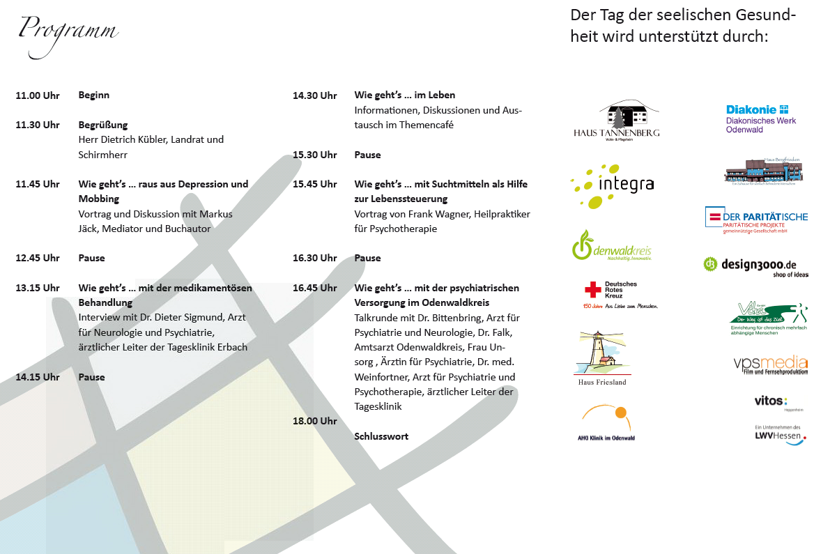Der Tag der seelischen Gesundheit möchte zum Austausch anregen und ein Diskussionsforum bieten. Unser Ziel ist es, die Rechte und Chancen seelisch kranker Menschen zu stärken und möglichst optimale Behandlungsmöglichkeiten zu schaffen. Genaue Informationen und das Programm finden Sie im Pdf.