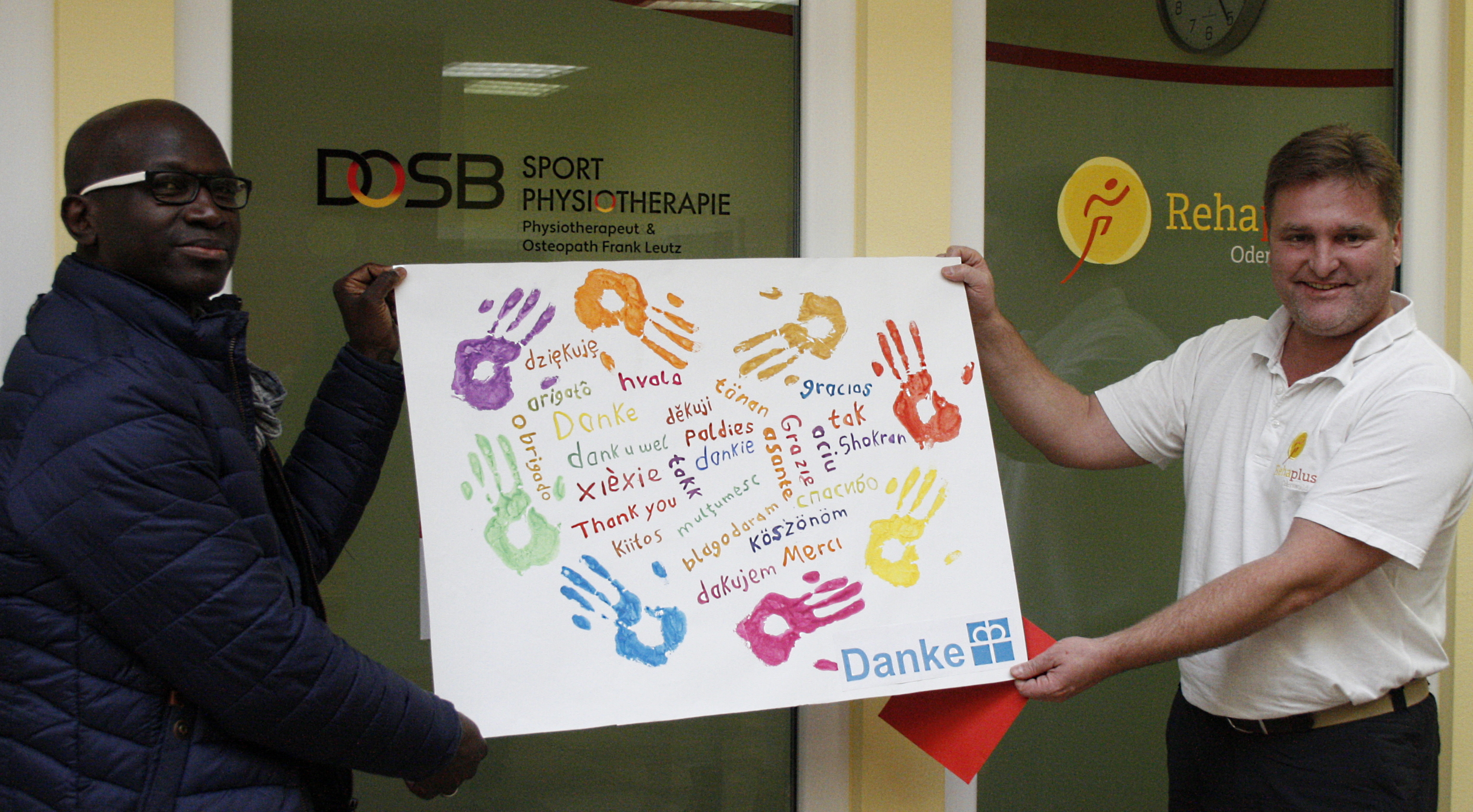 Eine tolle Überraschung gab es für den Frauensprachkurs im Diakonischen Werk zum Jahresende. Frank Leutz vom Haus Rehaplus in der Oberzent hatte in der Interkulturellen Woche (IKW) 2019 Dreihundertfünfzig Euro eingenommen, die er spendete. Leutz hatte ein Fest veranstaltet, bei dem man internationale Sportarten und Rehaplus Angebote bei leckerem Essen und Live-Musik kennen lernen konnte. Das gespendete Geld wird für den Frauensprachkurs im Diakonischen Werk verwendet, der dringend neue Grammatikbücher braucht. Auf dem Foto bedankt sich Aristide Sambou bei Frank Leutz mit einem Plakat, das im Rahmen eines Schulpraktikums für Spender der Diakonie entstanden ist. Auch bei der nächsten IKW wird Frank Leutz wieder dabei sein. Die findet vom 19.9. bis zum 4. Oktober statt. Kontakt und Informationen: aristide.sambou@dw-odw.de oder 060619650119